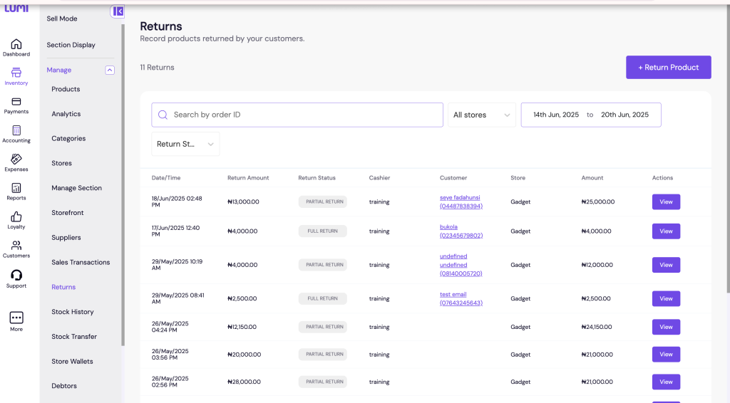 Each return is logged individually, showing the items returned, the staff member who processed the return, and the store involved. This page is accessible from both Sell Mode and Manage Mode, making it easy to reconcile returns at any time.