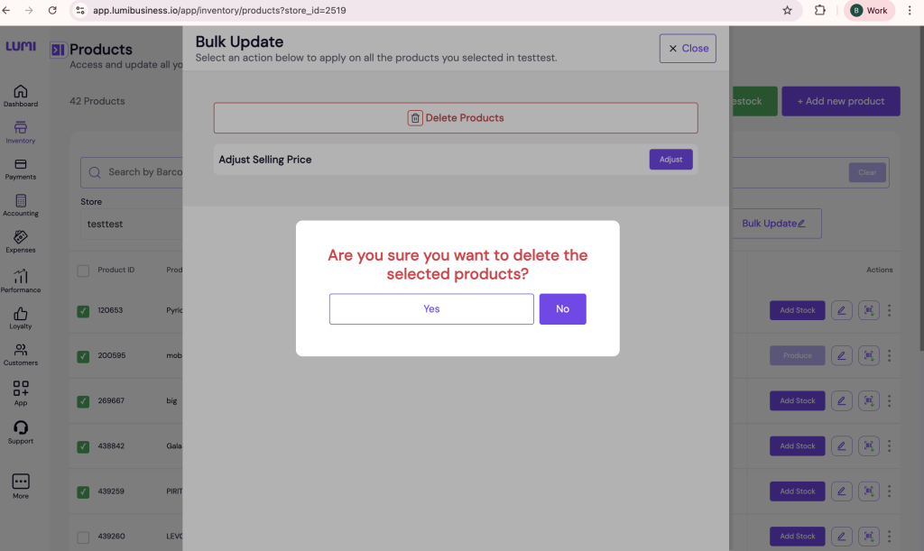 Bulk Delete allows merchants to select multiple products and remove them at once. This speeds up catalog management and simplifies cleanup processes during inventory restructuring. As an inventory management software Nigeria merchants use to manage large product catalogs, Lumi Business supports bulk actions that simplify daily operations.