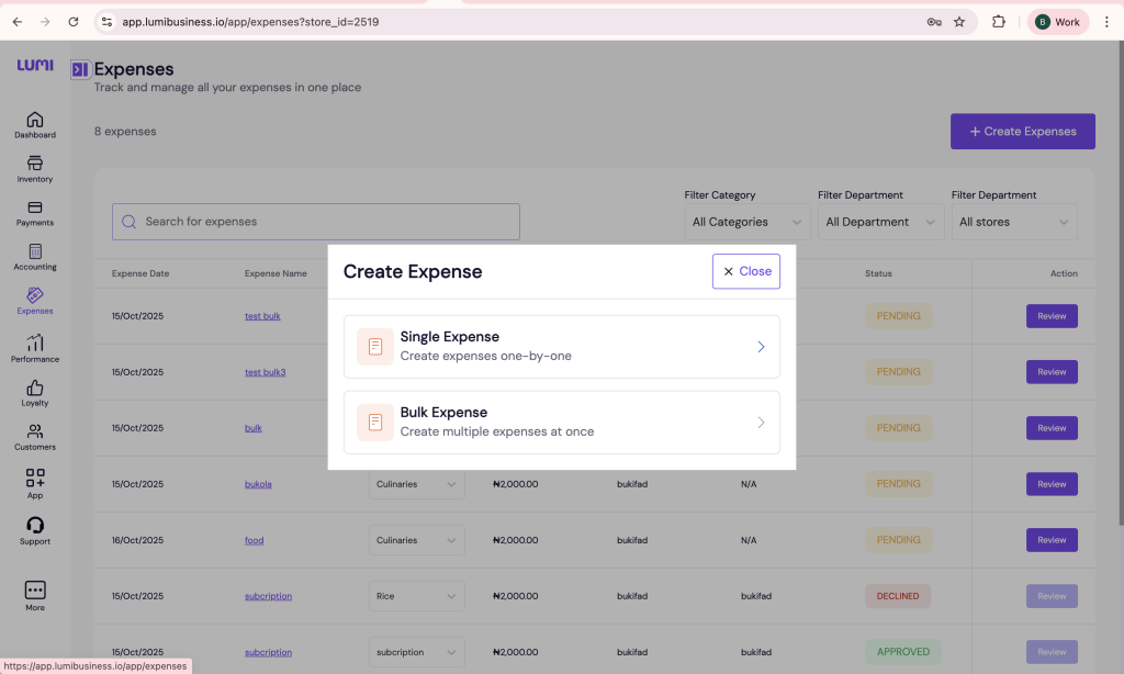Businesses often incur daily operational expenses—transport, petty cash, supplies, and store upkeep. Logging these individually is slow, inefficient, and prone to omission errors. Bulk entry reflects real Nigerian business workflows.